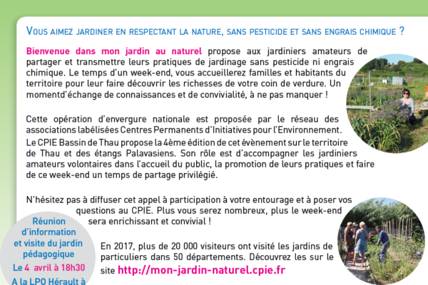 Appel à jardiniers ! Cultiver son jardin, un plaisir au naturel à partager ! Dans le cadre du projet Bienvenue dans mon jardin au naturel (BMJN), qui se déroulera cette année, sur Thau, le weekend des 2 et 3 juin 2018, des jardiniers amateurs ouvriront leurs jardins au public. Jardiniers amateurs, associations de jardins partagés, […]