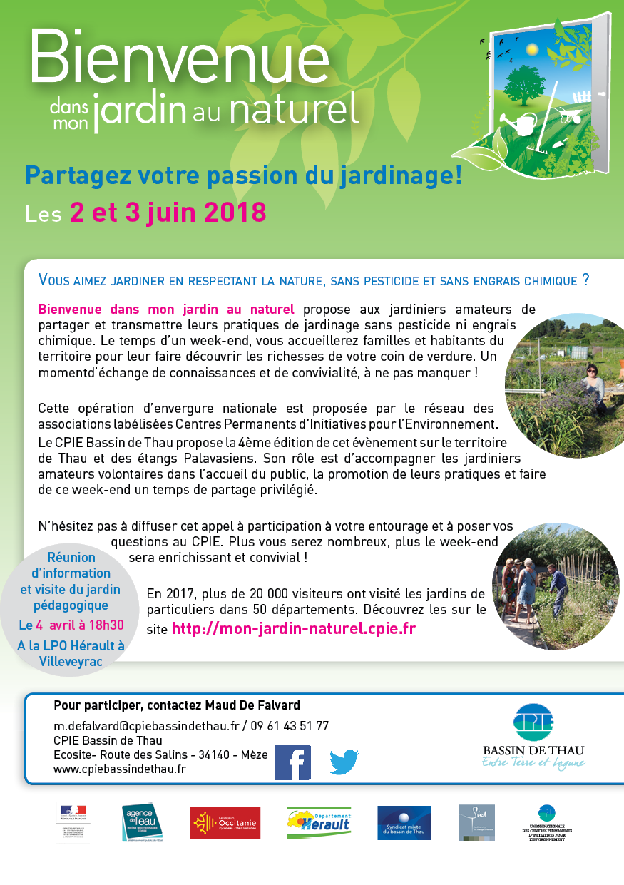 Dans le cadre du projet Bienvenue dans mon jardin au naturel (BMJN), qui se déroulera cette année, sur Thau, le weekend des 2 et 3 juin 2018, des jardiniers amateurs ouvriront leurs jardins au public.