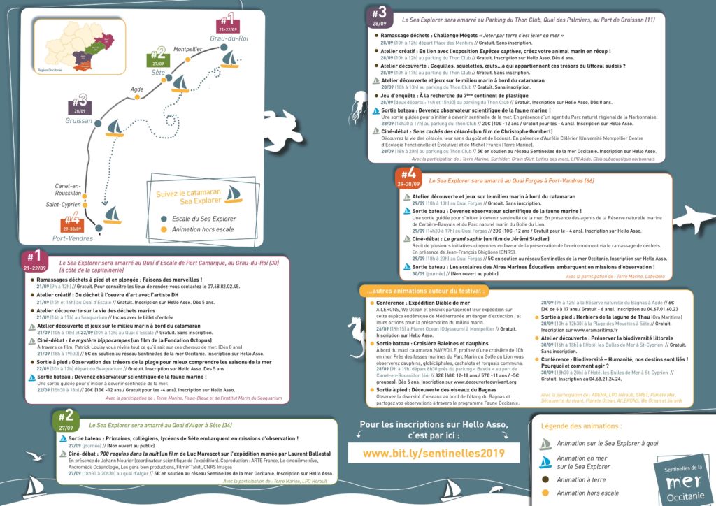 Du 21 au 30 septembre 2019, le festival » Tous sentinelles » se déploie sur la façade méditerranéenne d’Occitanie, à bord du catamaran Sea Explorer de Terre Marine (nouveau membre du CPIE Bassin de Thau).