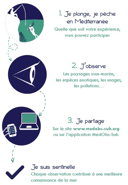 Créé en 2011 à l’initiative de l’Agence de l’Eau Rhône Méditerranée Corse, MedObs- Sub est un observatoire citoyen et participatif à destination des plongeurs et pêcheurs loisirs. Il est coordonné sur la façade méditerranéenne française par le CPIE Côte Provençale et entre dans les dispositifs de surveillance mis en place par l’Agence de l’Eau. Il a pour but de créer une dynamique citoyenne autour des usages et enjeux du territoire littoral méditerranéen. Le CPIE Bassin de Thau anime l’observatoire en Languedoc-Roussillon.